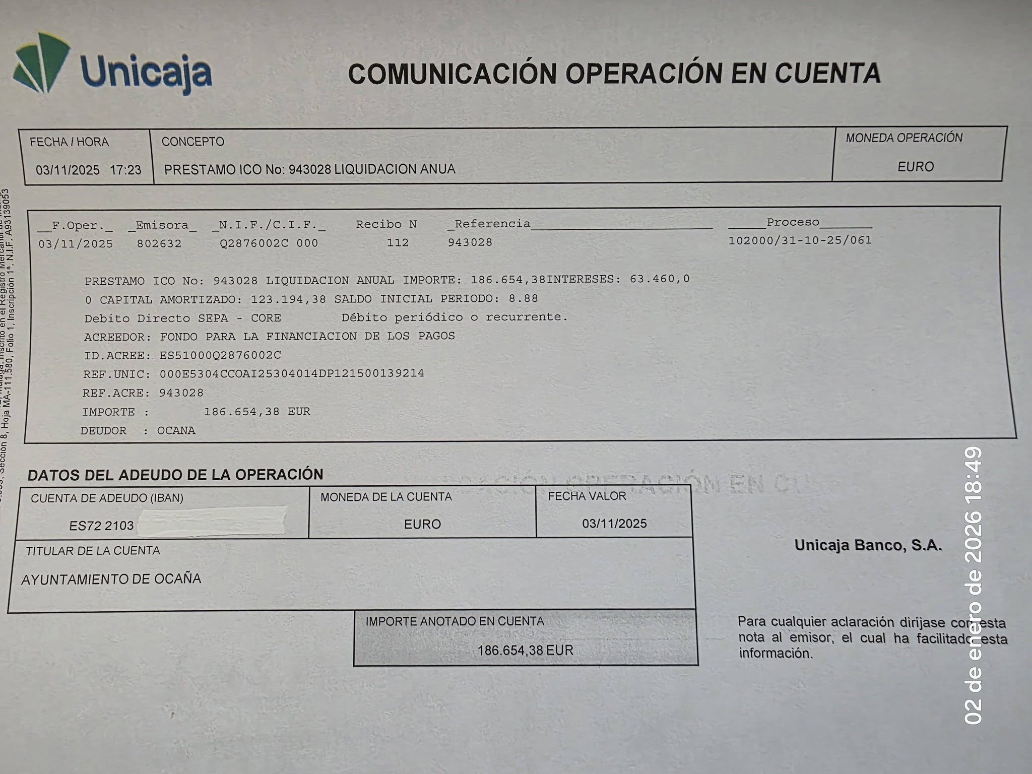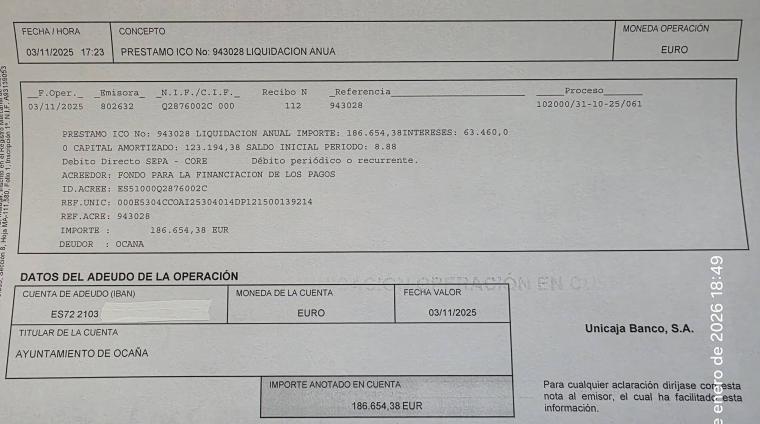 Durante el año 2025 el Ayuntamiento de Ocaña ha realizado el pago de 1.065.680,29 euros (capital + intereses) al Fondo de Financiación de Entidades Locales