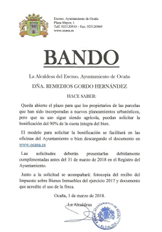 El modelo para solicitar la bonificación se facilitará en las oficinas del Ayuntamiento o por descarga en www.ocana.es