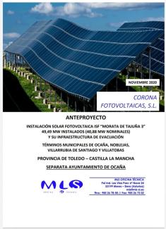 Según comunicación del Area de Industria y Energía de la Subdelegación del Gobierno, la empresa Corona Fotovoltaicas S.L ha solicitado la tramitación de la Autorización Administrativa Previa y la Declaración de Impacto Ambiental del Anteproyecto de Instalación Solar Fotovoltaica "Morata de Tajuña 3" situada en el término municipal de Ocaña (Carretera N-301 pk 66+159 dirección Villatobas). La exposición pública ha sido publicada en el BOE número 44 del 20 de febrero de 2021.