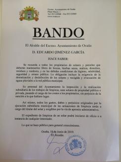 Se recuerda a todos lo propietarios de solares y parcelas que deberán mantenerlos libres de brozas, hierbas secas, maleza, desechos, residuos y roedores, y en las debidas condiciones de higiene, salubridad, seguridad y ornato público. La obligación incluye la exigencia de la desratización y desinfección de los solares y recogida y evacuación de aguas pluviales a la red pública municipal.