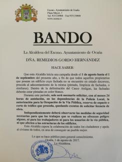 Con motivo de la llegada de las Ferias y Fiestas en honor a la Virgen de los Remedios, el Excmo. Ayuntamiento de Ocaña emplaza a los vecinos al adecentamiento de fachadas que no se encuentren en estado decoroso.