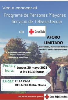 El Excmo. Ayuntamiento de Ocaña en colaboración con Cruz Roja Española, ha programado una charla informativa para el próximo día 20 de mayo a las 16.30 horas en el salón de actos de la casa de la cultura, con el objetivo de informar y dar a conocer los distintos programas existentes para mayores, tales como servicio de teleasistencia, servicio de acompañamiento domiciliario, traslados sociosanitarios, desarrollo de actividades complementarios- espacios de encuentros usuarios/as etc.