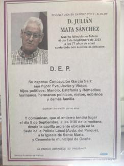Ha fallecido el Teniente Alcalde de Ocaña, Don Julián Mata Sánchez. La capilla ardiente está ubicada en la Jefatura de Policía Local.