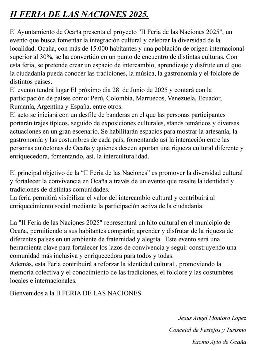 Disfruta de la Feria de las Naciones programada para el sábado 28 de junio de 2025.