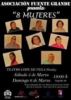 Este año, las actividades organizadas por el Ayuntamiento de Ocaña, para conmemorar y celebrar el Día Internacional de la Mujer, comienzan con la representación de la obra de teatro "8 Mujeres" representada por la Asociación de Mujeres "Fuente Grande" dirigida por Dña.María Ortega. Sin duda una obra que nadie puede perderse y a la que animamos a acudir porque, como siempre, nos brindaran una tarde divertida y amena.