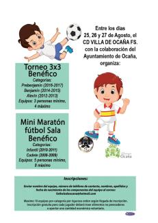 Entre los días 25, 26 y 27 de agosto, el CD VILLA DE OCAÑA FS. con la colaoración del Ayuntamiento de Ocaña organiza un torneo benéfico 3x3 y un Mini Maratón de Fútbol Sala.