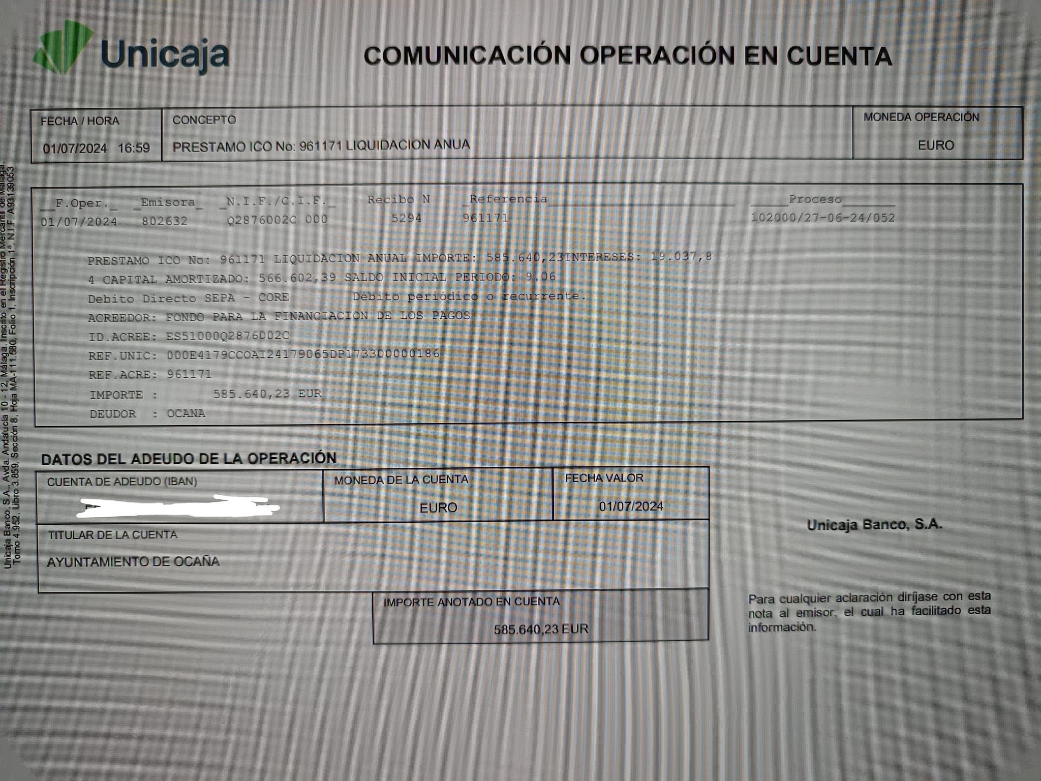 Hoy, el Ayuntamiento de Ocaña ha realizado el pago anual de 585.640,23 euros (capital + intereses) al Fondo de Financiación de Entidades Locales a través
