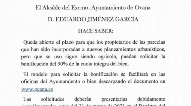 Abierto el plazo para solicitar bonificación del impuesto de bienes inmuebles para aquellas parcelas incluidas en nuevos planteamientos urbanísticos y que en la actualidad continúan