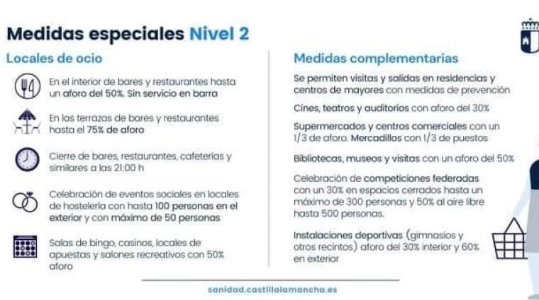 Puedes consultar todas las medidas en el siguiente enlace: https://sanidad.castillalamancha.es/ciudadanos/enfermedades-infecciosas/coronavirus/transicion-hacia-una-nueva-normalidad/medidas-especiales-de-contencion-frente-covid-19/medidas-especiales-nivel-2?fbclid=IwAR1rrCGYDHIzhZ76wxTNMm_0KLylOH_B9krceiJcH2e--5czzb8TtyIlSMw