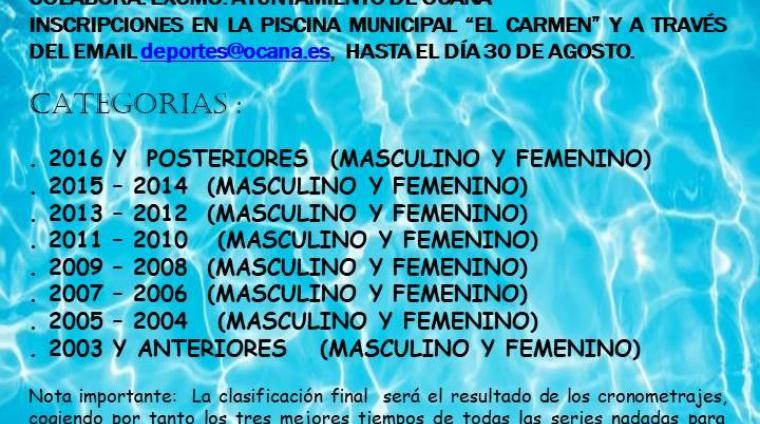 Día: 1 de septiembre Hora: 12.00 h. Organiza: Club Natación Ocaña y Club Natación Delfines de Ocaña Colabora: Excmo. Ayuntamiento de Ocaña Inscripciones en la