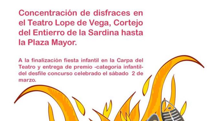 Concentración de disfraces en el Teatro Lope de Vega, Cortejo del Entierro de la Sardina hasta la Plaza Mayor. A la finalización finalización fiesta infantil