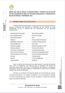 ASES QUE HAN DE REGIR LA CONVOCATORIA Y PROCESO DE SELECCIÓN DE 6 SOCORRISTAS PARA LAS PISCINAS MUNICIPALES Y FORMACIÓN DE BOLSA DE EMPLEO