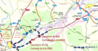 Afectación al tráfico en las carreteras TO-23 y N-400 por las obras para ampliar el drenaje a la altura del arroyo Ramabujas, en Toledo.