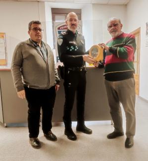 El. Ayuntamiento de Ocaña, por mediación de su alcalde D. Eduardo Jiménez y su concejal de Seguridad D. Juan José Rodríguez hacen entrega de esta preciada herramienta al Oficial Jefe de la Policía, David Carvajal.