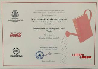 La Biblioteca Municipal de Ocaña ha recibido el título María Moliner 2017 por el proyecto "Nuestra biblioteca: sumérgete".