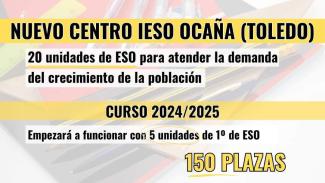 El Consejo de Gobierno de Castilla la Mancha ha aprobado en el día de hoy la creación de un nuevo Instituto de Enseñanza en Ocaña de 20 unidades, que empezará a funcionar en septiembre para el curso 2024/2025 con 5 unidades de 1° de la ESO y se ofertará un total de 150 plazas de la Educación Secundaria Obligatoria