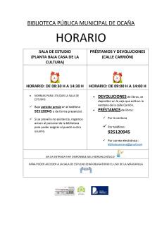Tras el adecuado acondicionamiento de nuestra sala de estudio e instalaciones: limpieza, desinfección e incorporación de todas las medidas necesarias para garantizar la seguridad tanto del personal de biblioteca como de los usuarios, la Biblioteca Pública Municipal de Ocaña reanuda el servicio de sala de estudio con las siguientes normas y condiciones de acceso: