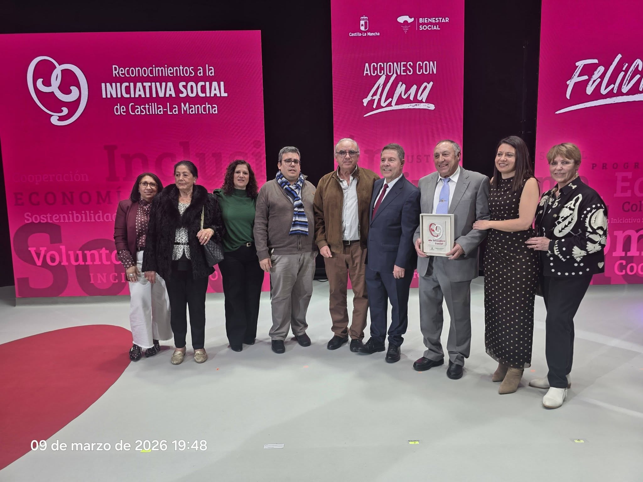 El Alcalde de Ocaña, Eduardo Jiménez y concejales del equipo de gobierno acompañando a Emilio Fernández Montoya que ha recibido en nombre de la Asociación Gitana "Juventud de Ocaña" el reconocimiento a la iniciativa social en la categoría de acción social otorgado por el Gobierno Regional, en la gala celebrada en Mondejar (Guadalajara).