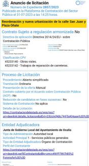 En el día de hoy se inicia el plazo para que las empresas interesadas presenten oferta para realizar la obra de reordenación y nueva urbanización de la calle San Juan y Plaza de Oñate del municipio de Ocaña.