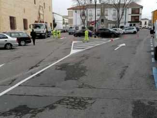 La Brigada de Pintura de la Diputación de Toledo realizando trabajos de pintura de señalización horizontal en diferentes zonas de la localidad.