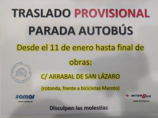Con motivo del inicio de las obras en la zona del Paseo (Avenida del Generalísimo), la parada de autobús se traslada a la Calle Arrabal de San Lázaro (frente a bicicletas Maroto) desde el 11 de enero, (miércoles) hasta finalización de obras