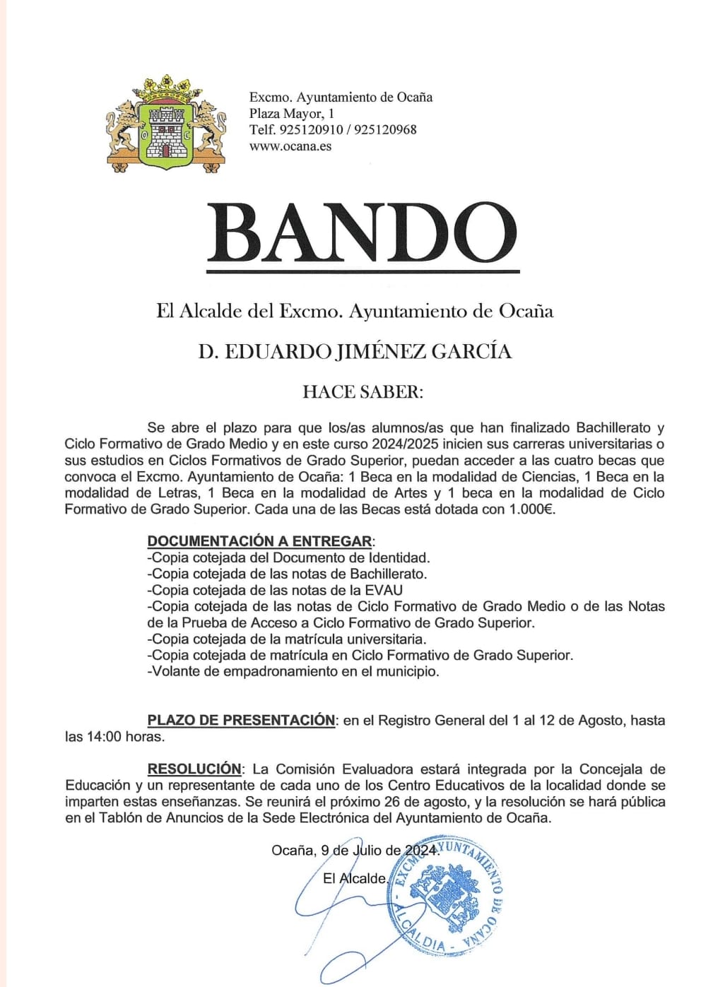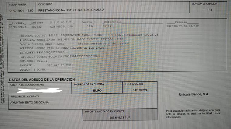 Hoy, el Ayuntamiento de Ocaña ha realizado el pago anual de 585.640,23 euros (capital + intereses) al Fondo de Financiación de Entidades Locales a través
