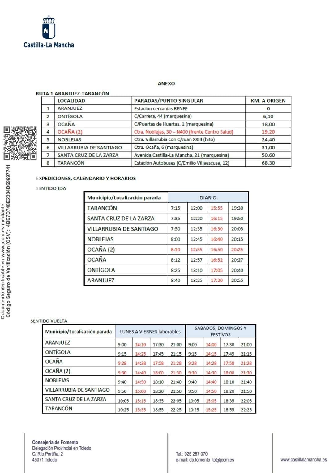 Modificación de horarios del servicio de autobús de la línea Tarancón- Aranjuez, que presta la empresa INTERBUS debido a la prórroga del contrato. Nueva parada