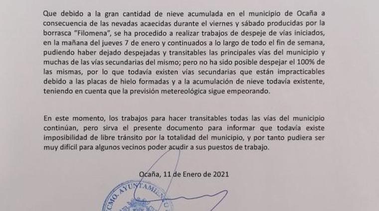 Ante los fenómenos meteorológicos adversos , hacemos las siguientes recomendaciones a los ocañenses: - Circular con el vehículo lo imprescindible y evitando cuestas. - Evita