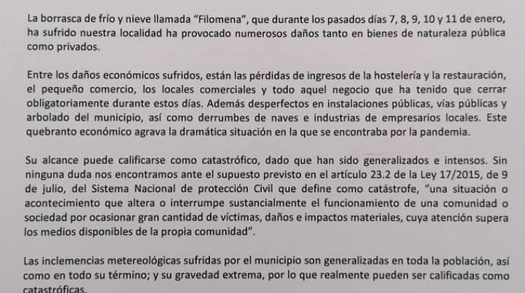 Habiéndose declarado por el Gobierno de España la declaración de Zona Catastrófica para los territorios afectados por el temporal "Filomena", entre los que se encuentra