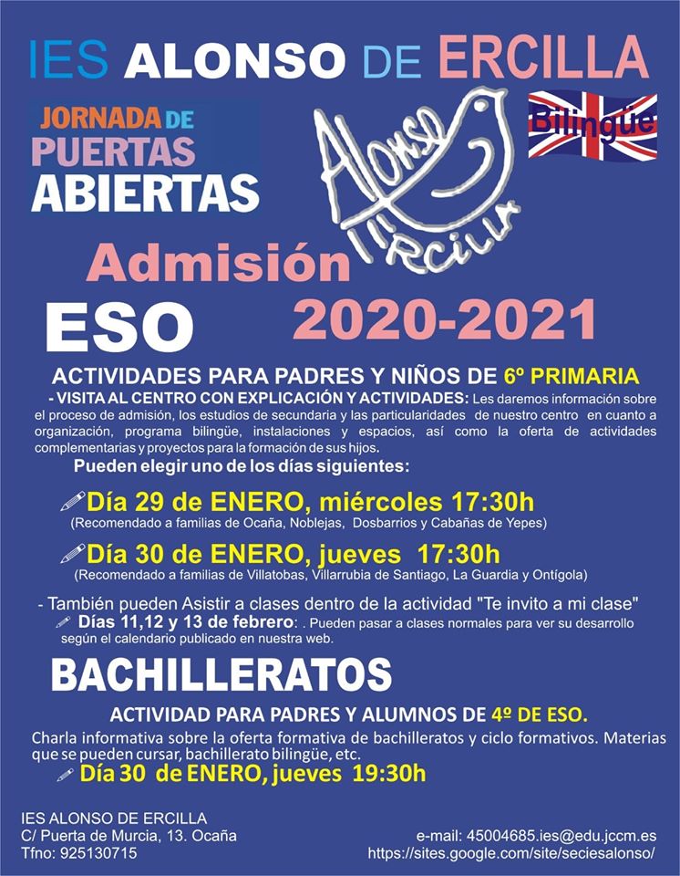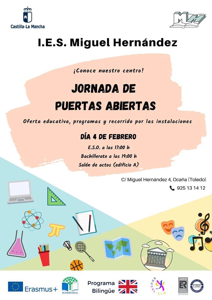 Oferta educativa, programas y recorrido por las instalaciones 17.00 h. ESO 19.00 h. Bachillerato Día: martes 4 de febrero Lugar: Salón de actos (edificio A)